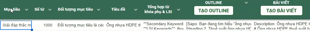 - Cột G (Mục tiêu): Hãy cho AI biết mục đích của bài viết là gì. Đừng chỉ viết chung chung! Một mục tiêu càng chi tiết, AI sẽ viết càng hay và có tính kêu gọi hành động (Call-to-action) tốt hơn.